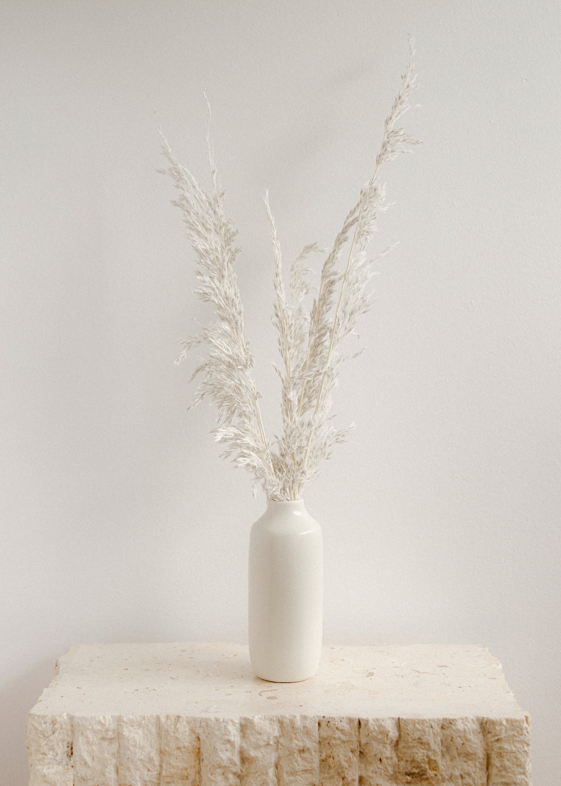 7 stems of White Ampelodesmos displayed in the Mika Vase. Available in 5 or 10 stems bundles. For 14 stems bundle, we suggest going with the Kaja Vase.