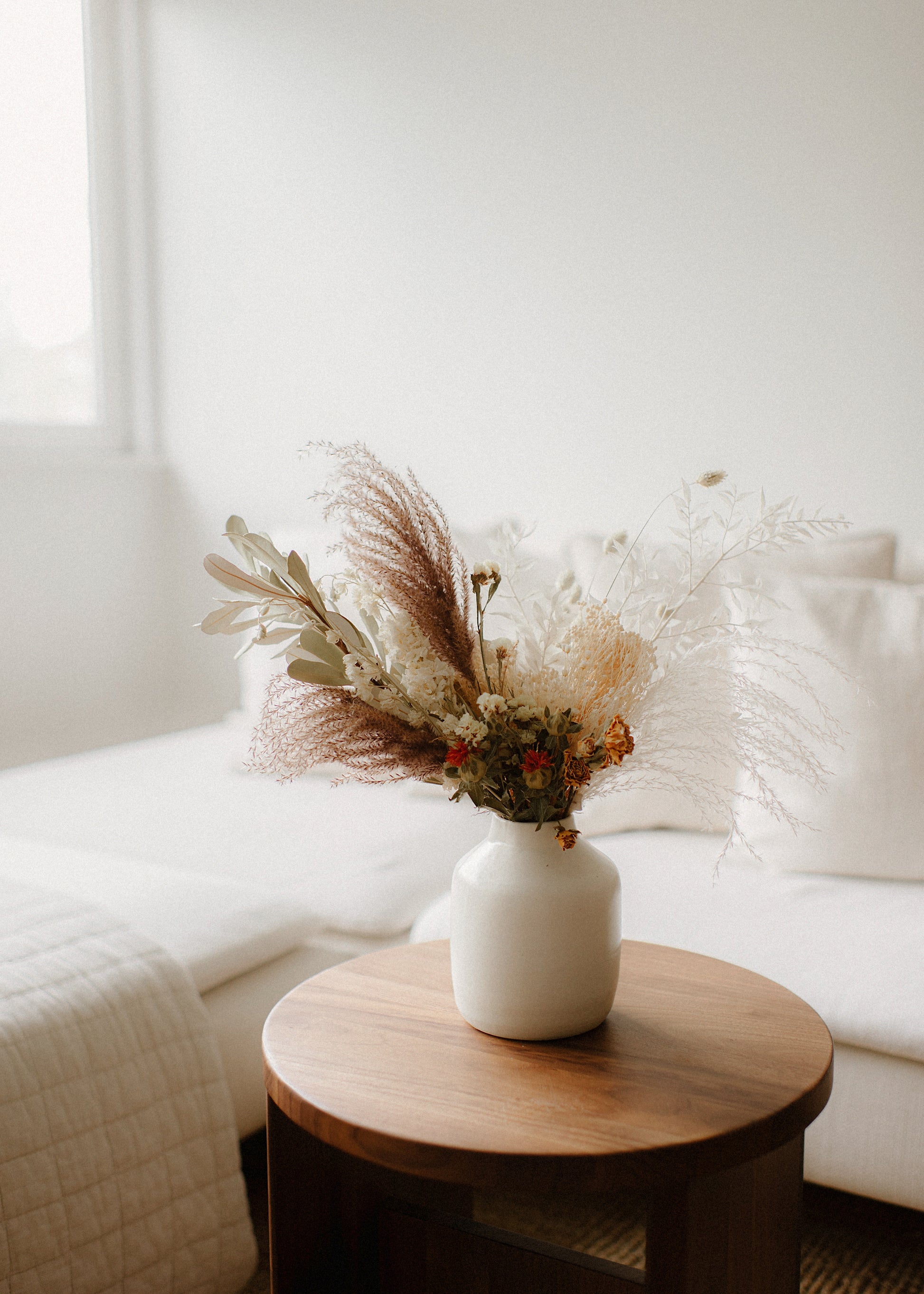 This medium arrangement of preserved botanicals and dried florals comes in a handmade ceramic jug vase. With its subtle curves and weighted bottom, bring a bit of nostalgia back into your home.